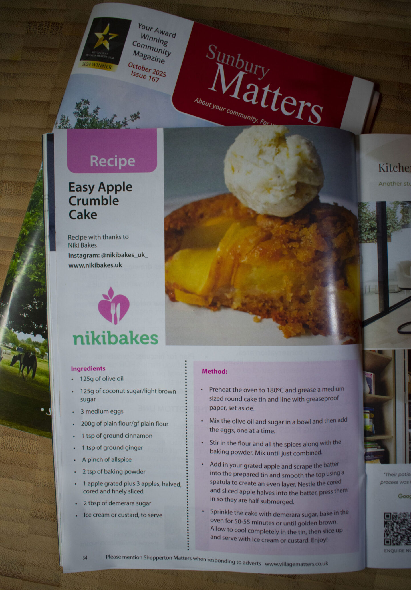 nikibakes October 3, 2025 nikibakes x Shepperton Matters and Sunbury Matters Like this:Like Loading... Follow: nikibakes Hi there! Welcome to my page, dedicated to sharing healthy and tasty food for all. Enjoy! Niki x You may also enjoy:nikibakes Wins Best Independent Business In Walton 2025!Easy Apple Crumble CakeSwedish Style Meatballsnikibakes bakery stall launch!