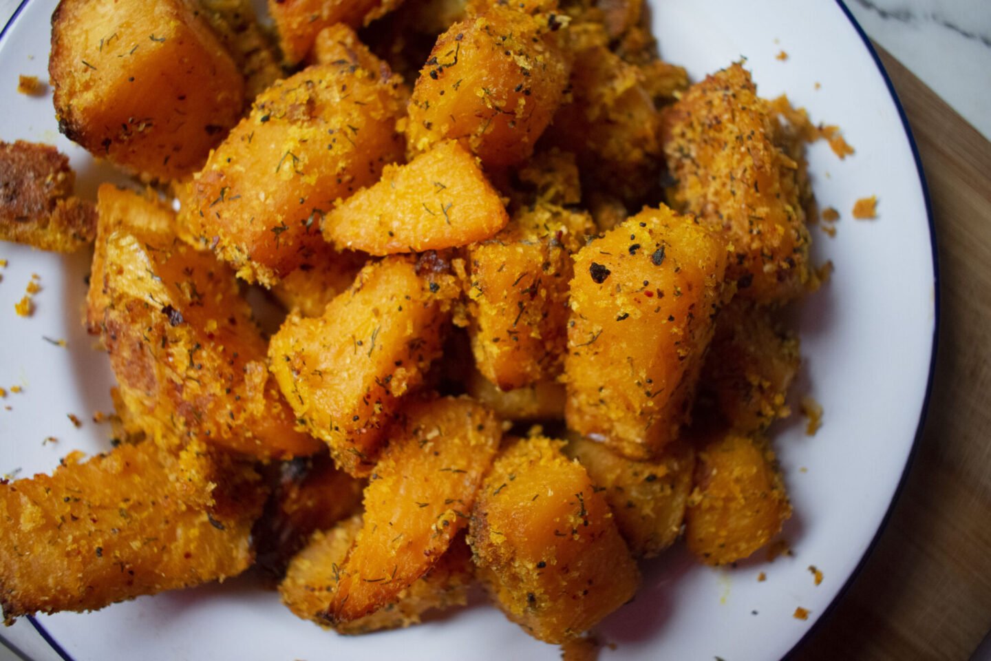 3. Meanwhile, in a food processor, whizz the remaining ingredients together to form a very rough crumb. Scatter all over the swede roasties and mix again so the crumbs can stick. Return to the oven for a final 10 minutes until the breadcrumbs are crisp and golden brown. Enjoy.