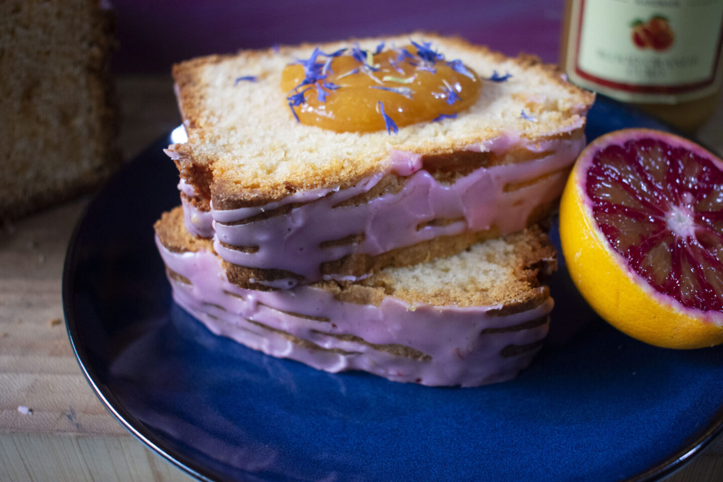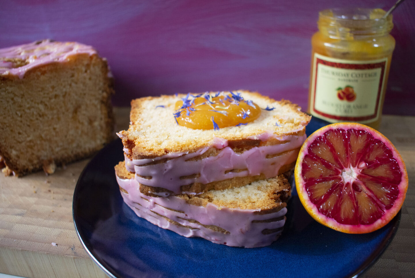 5. Slice, spoon Thursday Cottage Blood Orange Curd over each slice, top with blue cornflowers.