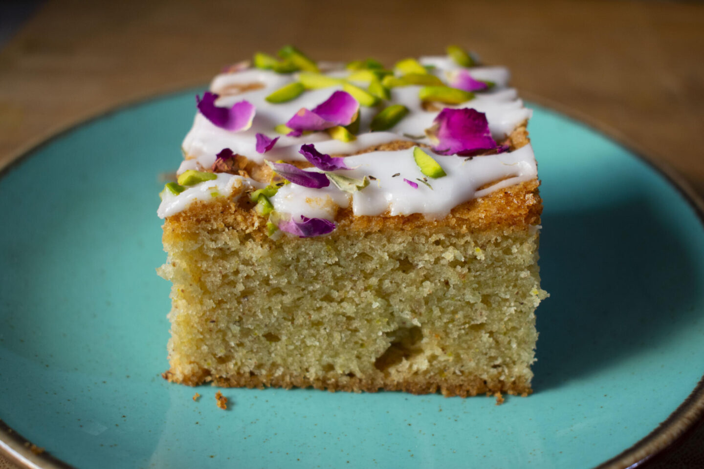 - Drizzle icing paste, finish with rose petals and slivered pistachios.